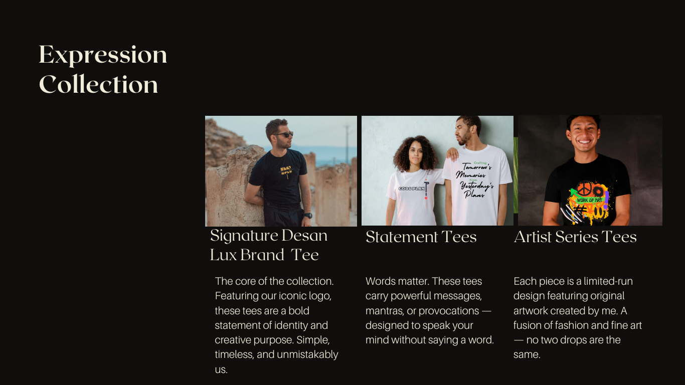 At Desan Lux, we celebrate diversity and uniqueness. We understand that every individual has a story to tell, and our apparel is designed to help you tell yours. Our goal is to create more than just clothing; we create experiences that empower you to stand out, make a statement, and feel confident in your own skin.